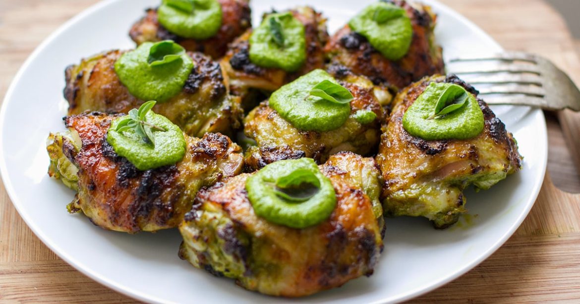 Remove the cooked chicken to a plate, facing them skin side up (or whichever way you like). Scoop a teaspoon of the reserved green sauce on top of each piece and garnish with a fresh herb leaf, if you like. Serve with extra lemon on the side.