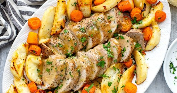 Remove pork and let rest 5–10 minutes. While it rests, return veggies to oven at 220–225°C / 430°F for another 5–10 minutes to crisp up.