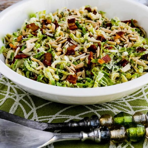 Brussels Sprouts Salad with Bacon, Almonds, and Parmesan uses shaved raw Brussels Sprouts for an interesting and delicious low-carb salad. And you can toss in a few dried cranberries if you want to turn it into a holiday salad and you don’t mind a few more carbs!