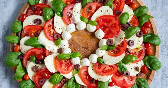 The Caprese wreath is a festive take on the classic Caprese salad, combining creamy mozzarella, juicy tomatoes, and fragrant basil in a stunning circular arrangement.