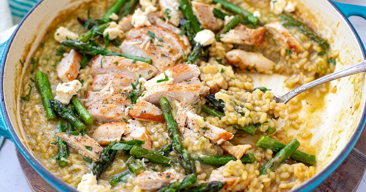 This creamy chicken risotto with asparagus is a comforting, healthy dinner recipe that’s high in protein and fiber, perfect for weeknights or dinner parties.