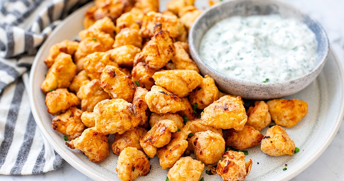 These are super versatile. Serve them with your favorite dip—yogurt ranch, aioli (sun-dried tomato or rosemary chili), bang bang sauce—or pile into a wrap, salad bowl, or lunchbox. I often serve them with air-fried chips or roasted sweet potatoes for a fun, high-protein dinner that doesn’t feel like “healthy food.” And of course, you must try my popcorn chicken bowls.