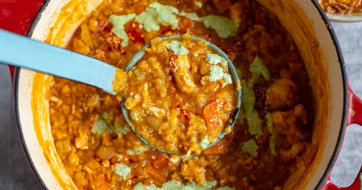 This chicken lentil soup is hearty, wholesome, and bursting with flavor! It’s packed with protein and fiber, lightly spiced, and finished with a tangy cilantro yogurt sauce. A drizzle of chili oil for a chef’s kiss completes this healthy soup.