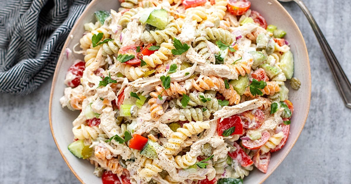 - 🥕 Main Ingredients: Chicken, pasta, Greek yogurt, mayonnaise, fresh vegetables