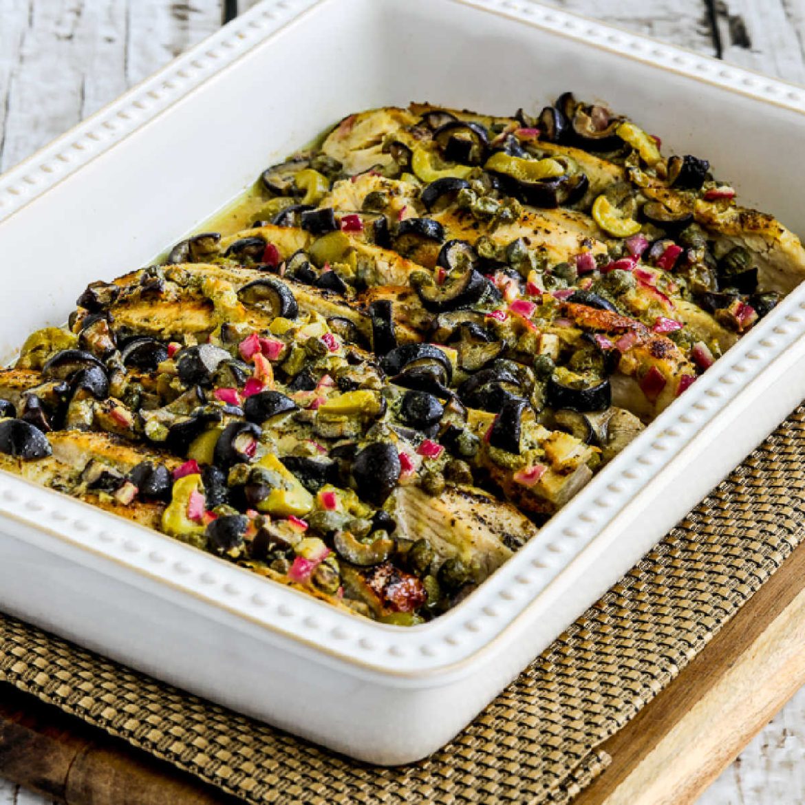 For this weeks Friday Favorites pick, I’m featuring this Chicken with Olives and Capers that’s one of my recipes for the quick and easy low-carb dinners that I call chicken bakes. These are recipes where chicken breasts are seasoned and quickly browned, cut into strips, put into a baking dish, and then finished in the oven with some kind of topping or sauce.