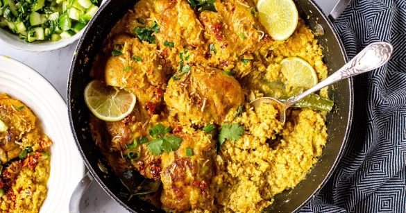 Creamy coconut chicken and cauliflower rice is a one-pot meal that’s healthy and totally satisfying. Served with a fresh and zingy cucumber salad, this chicken dinner is gluten-free, grain-free, low-carb, Paleo, and Whole30 friendly.