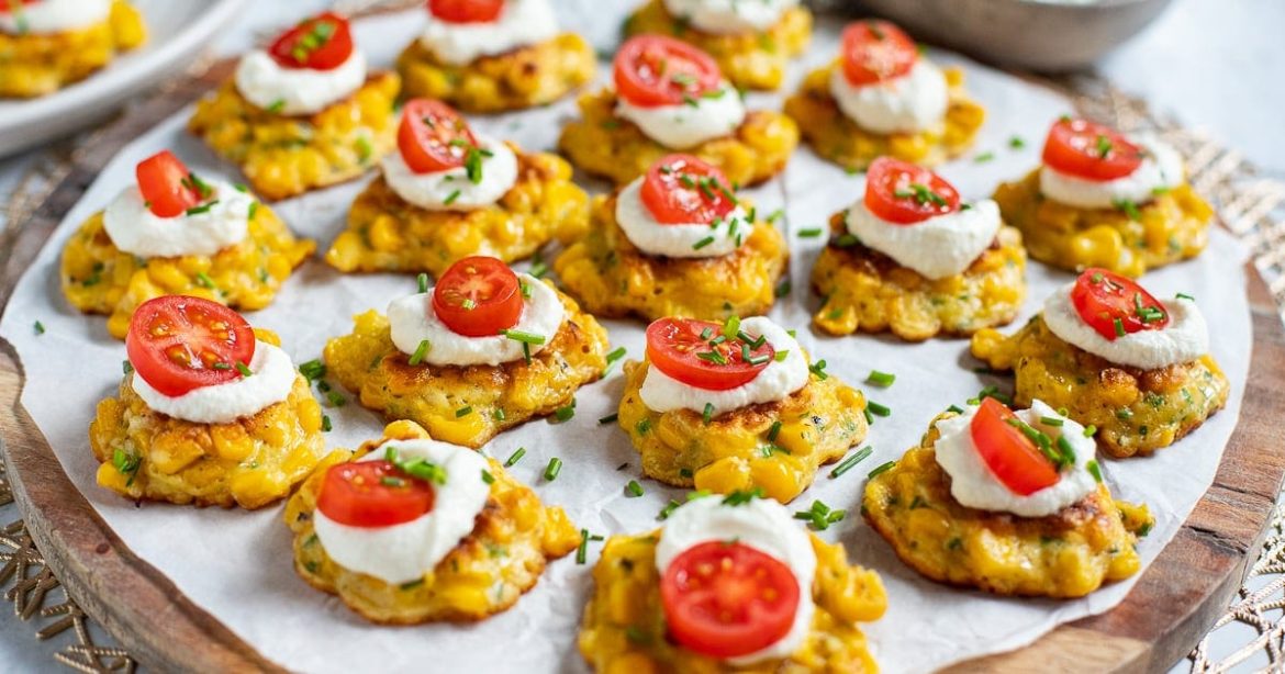 These sweet corn fritters are crispy on the outside, soft on the inside, and packed with bursts of juicy corn, bell peppers, and herby chives. The whipped feta topping, creamy with a salty tang, takes them to the next level. Top it all with fresh cherry tomatoes for a pop of acidity and a sprinkle of extra chives.