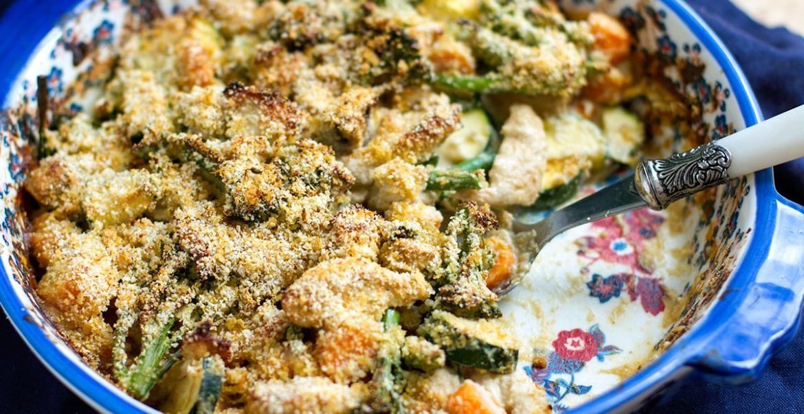 Assemble the casserole:Add raw vegetables, mushrooms and pre-cooked turkey to a large casserole dish or an oven-proof baking tray. Pour the sauce over the top and stir through well. Sprinkle evenly with the crumbs mixture. Place the casserole dish in the oven, middle shelf, and cook for 20 minutes.