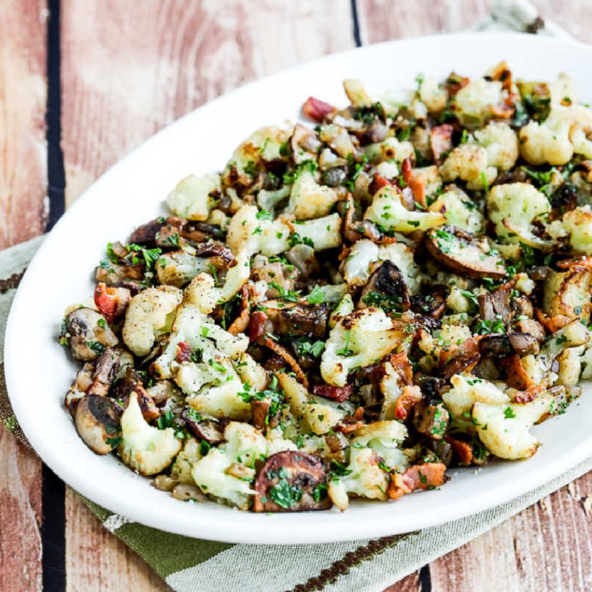 And this very tasty combination with cauliflower, bacon, and mushrooms is something I’d love for an easy dinner (with BACON) if you wanted to serve it as a main dish. If you’ve never heard of frying cauliflower, I bet you’re going to love this recipe; I hope you try it!