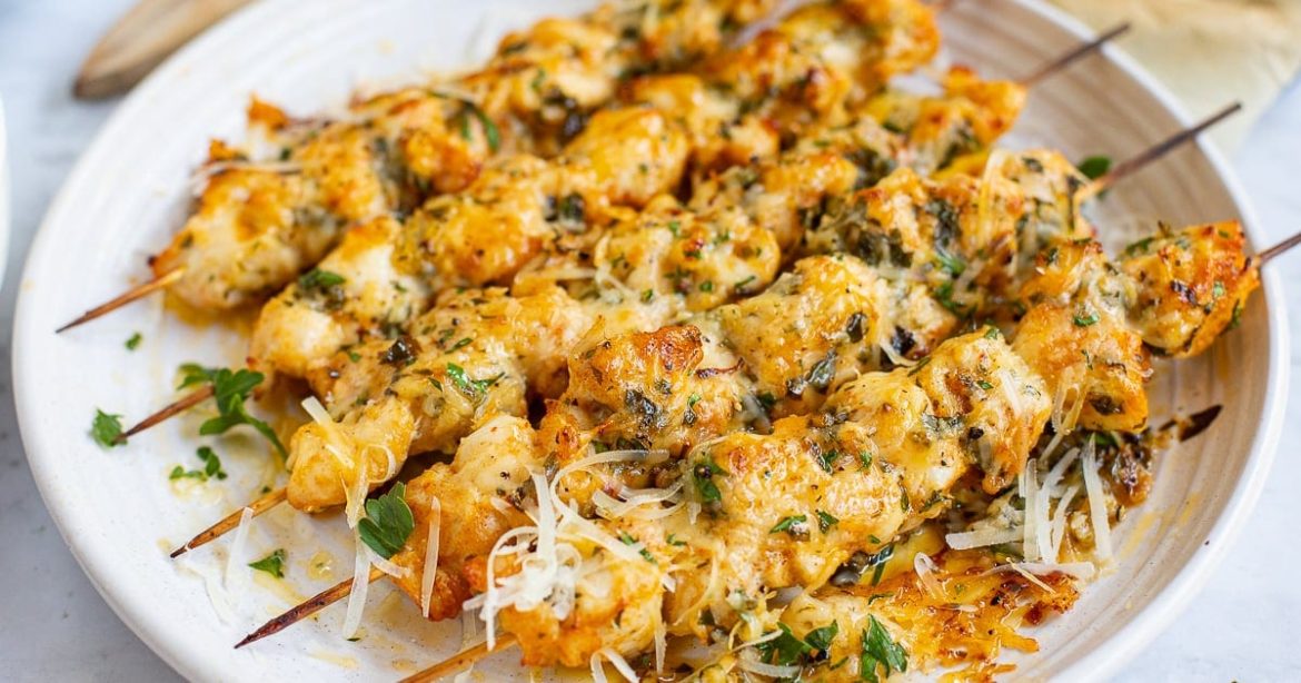 What I love about these is how easy they are. A few simple, bold flavors that come together fast. And if you’re not in the mood to thread skewers (which, let’s be honest, sometimes I’m not), you can bake the chicken tenders whole and still get all that garlicky, cheesy goodness.