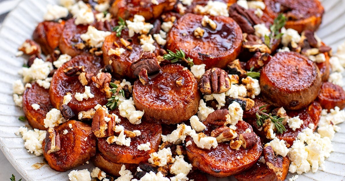 These glazed sweet potatoes are roasted until golden, brushed with a sweet and tangy balsamic glaze, and topped with feta and toasted pecans. Perfect side dish for holidays or cozy fall dinners.