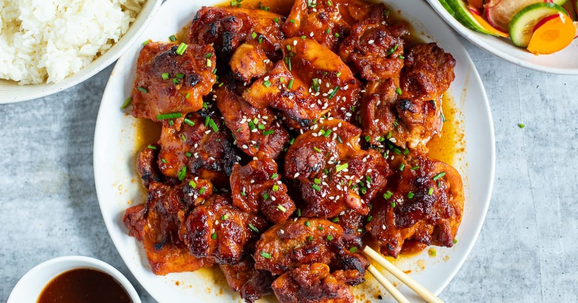 Juicy chicken thighs are marinated in a sweet-spicy mix of gochujang (it’s an incredibly tasty Korean chili paste), honey, soy sauce, and garlic, then baked until caramelized and slightly sticky.