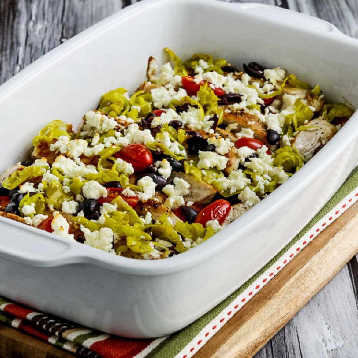 This low-carb Greek Chicken Bake is loaded with everyone’s favorite Greek flavors and this easy-to-make dinner is absolutely delicious! And you can make this chicken bake recipe without the spicy Greek Peperoncini if you’re not a fan of that.