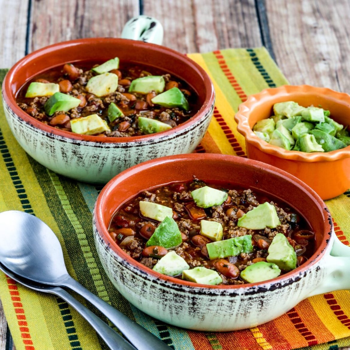 If you check the nutritional information you’ll see that our change of doubling the ground beef and adding a bit more stock made this a recipe with about 22 net carbs in a serving. If you’d like a version with even fewer carbs, just reduce the pinto beans to one can and add about another cup of chicken broth, for a soupier version.