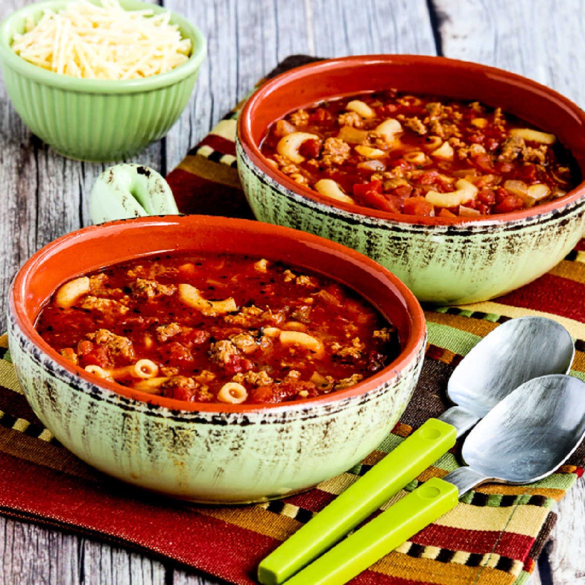 The original version of this soup was posted December 2010! The recipe was updated to a more carb-friendly soup, including the option to replace the macaroni with cauliflower rice April 2020. It was last update with more information in 2023.