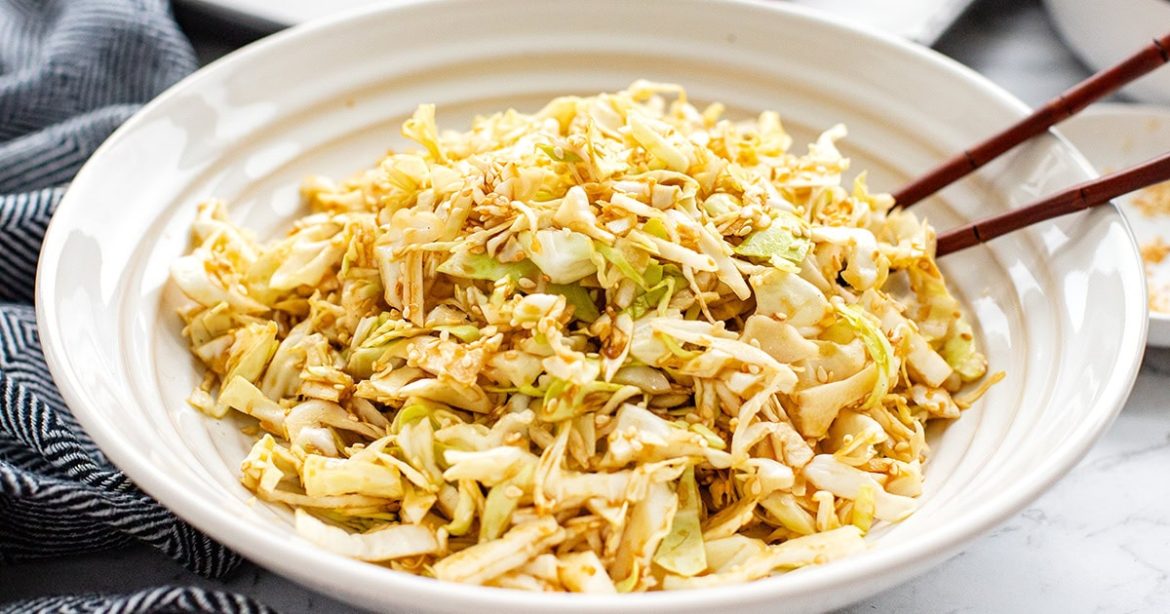 - Right before serving, pour dressing over cabbage, toss well, and top with sesame seeds.