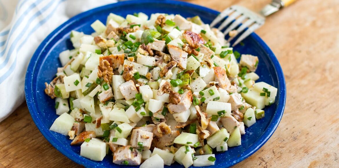 - Dice the chicken breasts into cubes and add to the salad. Add the dressing and mix well together. Garnish with extra chives and walnuts. Enjoy!