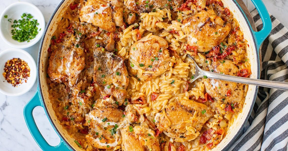 Marry Me chicken orzo bake is a creamy one-pot pasta dinner made with chicken thighs, sun-dried tomatoes, garlic, and orzo baked in a luscious sauce.