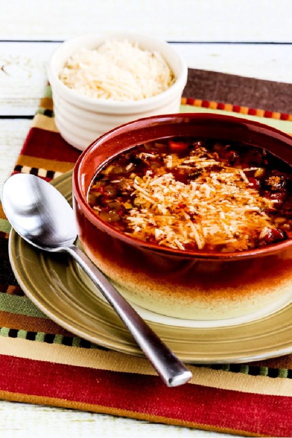 I switched it up in my lower-carb version of this famous soup by adding both ground beef and turkey Italian sausage, replacing the pasta with chopped zucchini noodles, and using fewer beans, which cut down the carbs to 9 net carbs per serving.