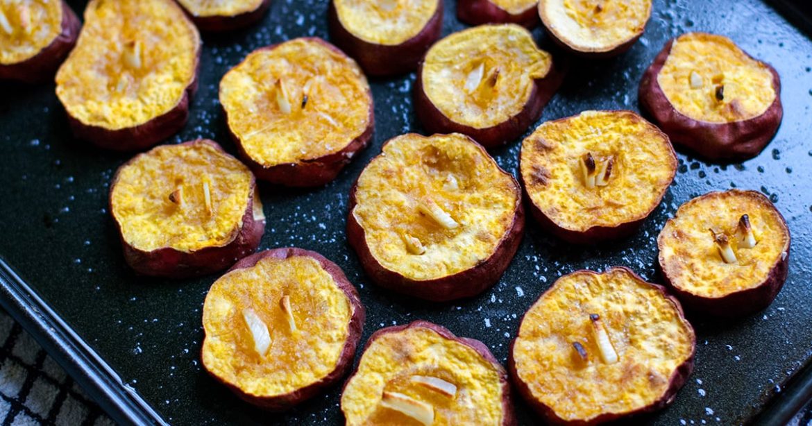 By inserting pieces of garlic inside the almost cooked sweet potatoes, you get that lovely roasted garlic flavour and aroma right through the flesh of the potato and they turn into the most delicious bites ever.