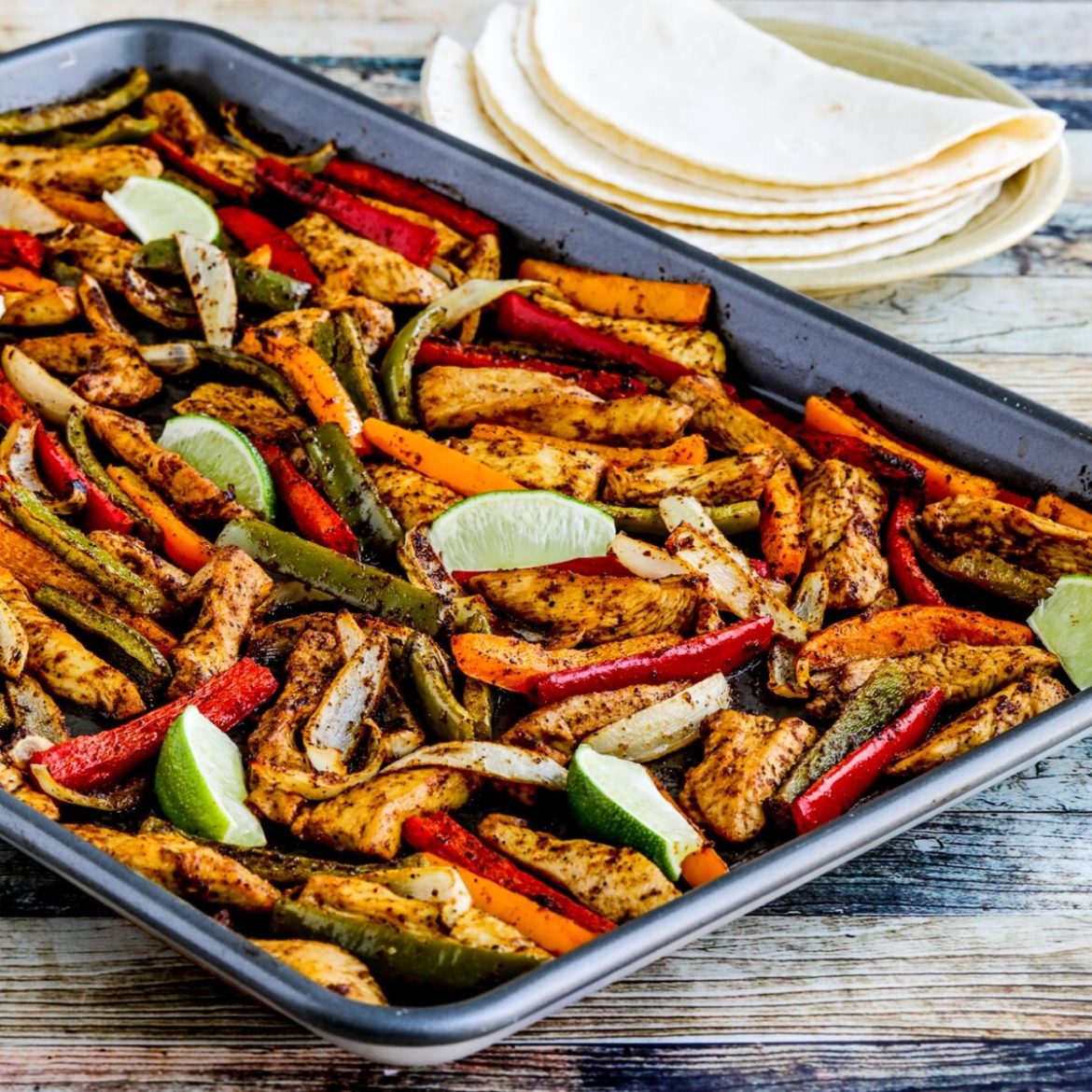 close-up photo of Sheet Pan Chicken Fajitas on pan with tortillas on plate