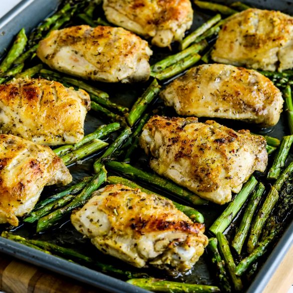 This new recipe for easy Sheet Pan Chicken Thighs and Asparagus is a great one-pan meal any time you don’t mind using the oven. And it’s especially a great dinner idea right now while asparagus is inexpensive in the stores!