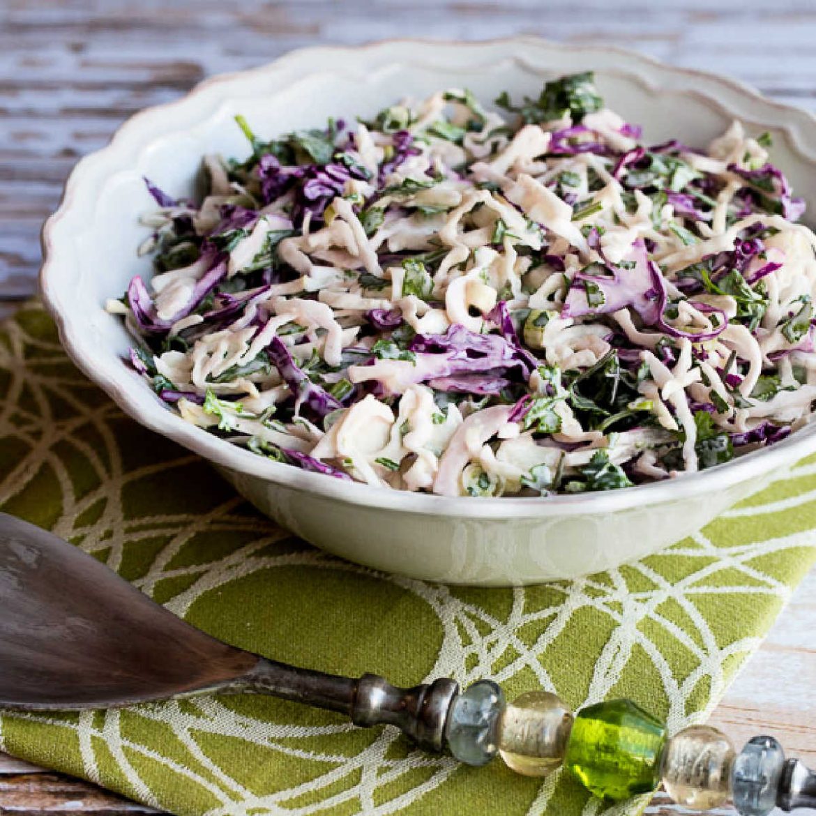 Spicy Mexican Slaw with Lime and Cilantro is a perfect side dish for most low-carb eating plans, including any phase of the original South Beach Diet, and it’s also gluten-free, meatless, and vegetarian. South Beach would prefer low-fat mayo; other low-carb diets would prefer full-fat, so take your choice on that.