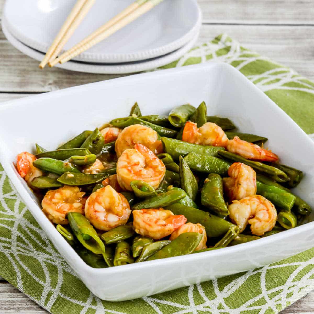 Stir-Fried Shrimp and Sugar Snap Peas is an ultra-easy recipe with a minimal amount of thickener to keep it low in carbs. And this tasty shrimp stir fry can literally be on the table in minutes!