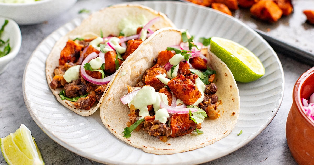 Assemble tacos: Spoon in black beans, add sweet potatoes, top with crema and pickled onions. Finish with lime and cilantro.