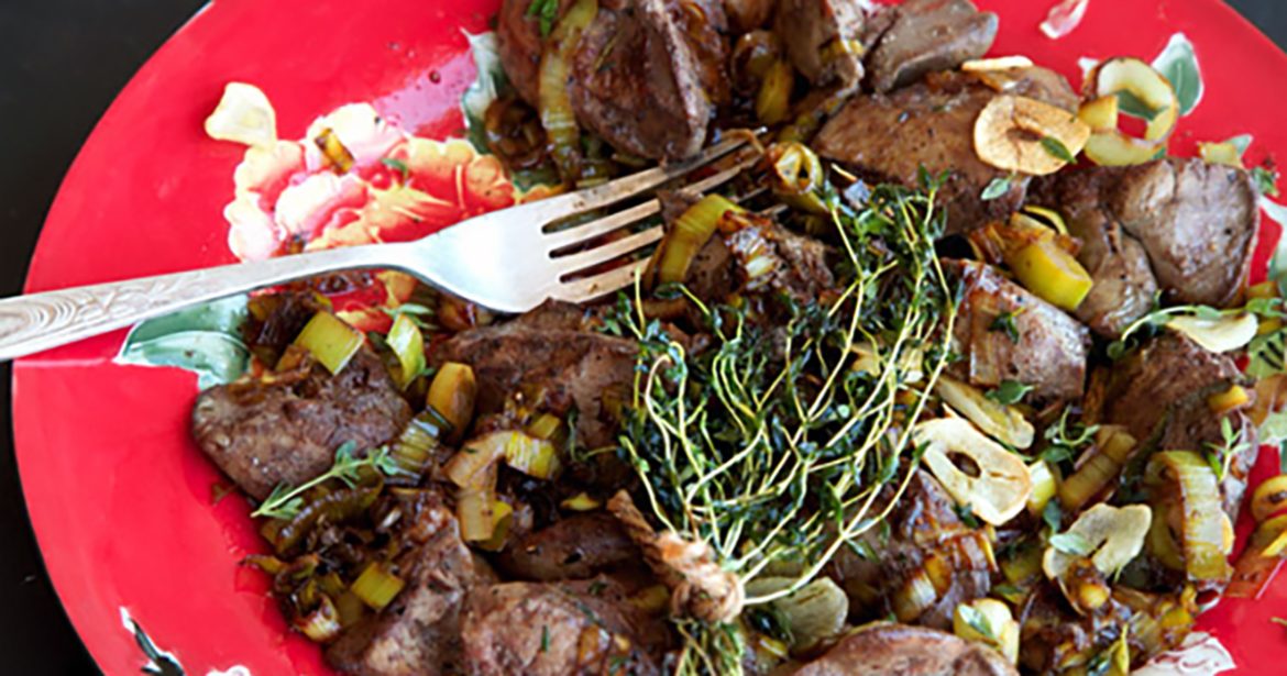 This easy chicken liver recipe is tasty and nutritious. Pan-fried with thyme, garlic and sweet balsamic leeks, the livers are superb in this simple dish.