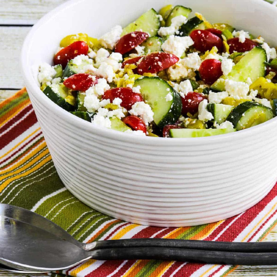 Tomato Cucumber Salad with Peperoncini would be great with Chicken Souvlaki, Greek Pork Chops, Very Greek Grilled Chicken, Grilled Cuban Flank Steak, or Low-Carb Marinated Beef Kabobs for a low-carb meal.