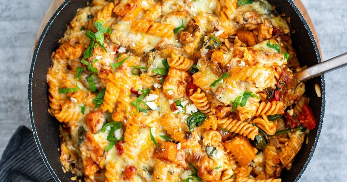 - Combine the pasta: Add the pre-cooked pasta to the sauce along with the mushrooms and most of the roasted butternut squash. Add the feta cheese and stir through. Place any remaining butternut squash pieces on top and finish the dish with grated Cheddar or Mozzarella.